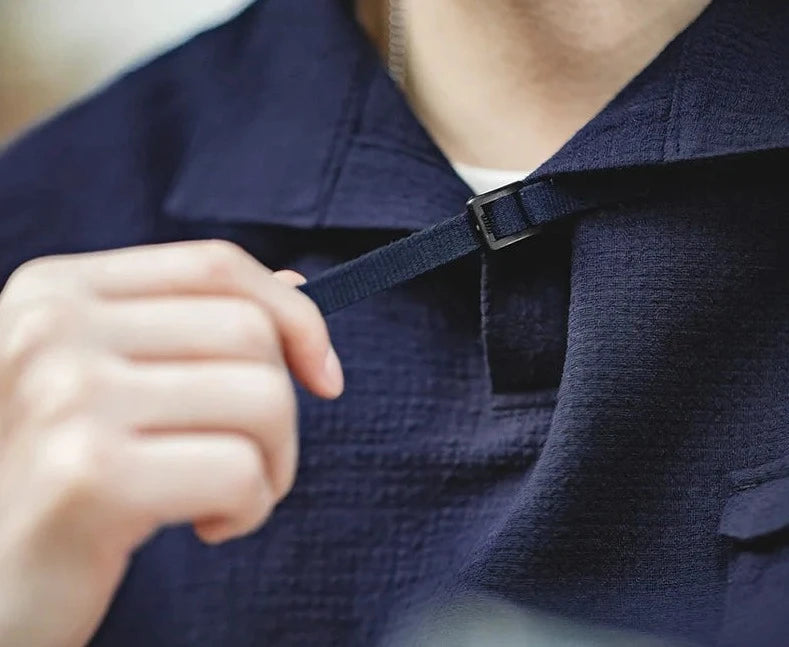 - Open neck collar with buckle strap