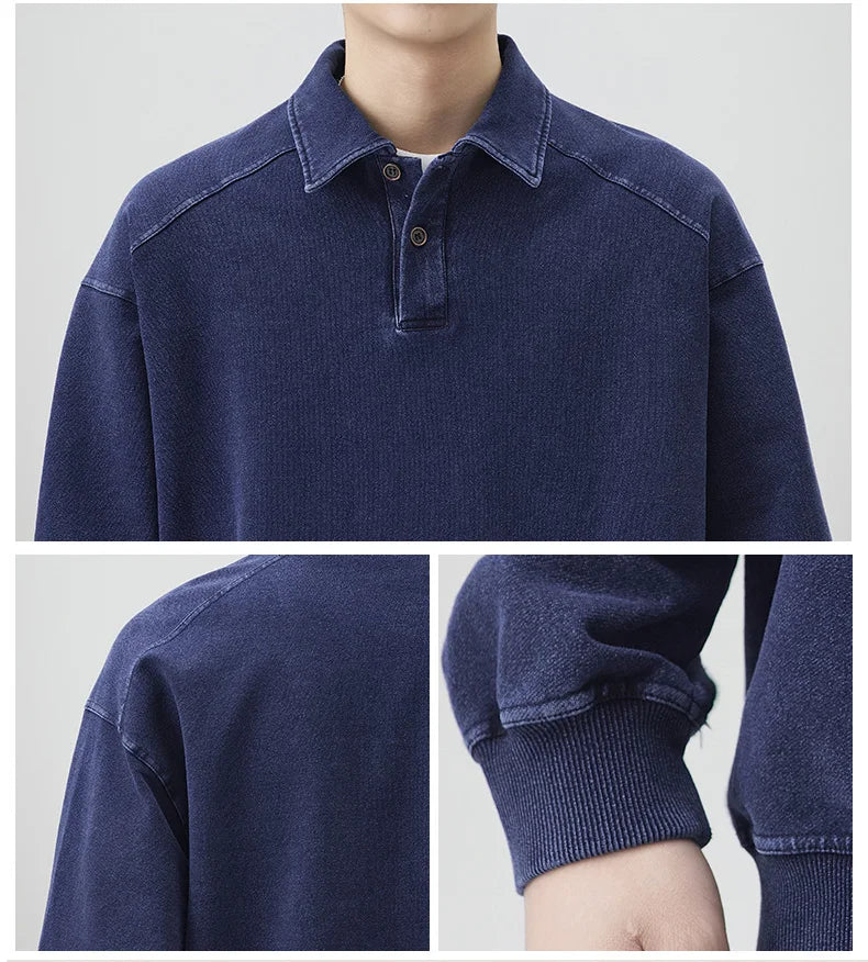 A retro sportswear classic reimagined, the Vintage Wash Rugby Sweat combines the structure of a polo collar with the ease of a sweatshirt. Crafted from a soft cotton-poly blend, it’s treated with a vintage wash for a worn-in character and finished with ribbed trims for shape. The relaxed silhouette makes it versatile for layering, delivering a Seoul streetwear take on a timeless athletic staple.