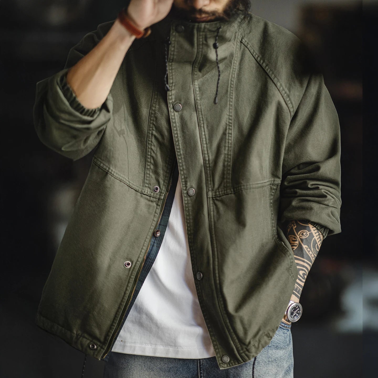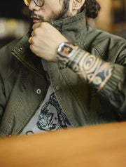 A practical outer layer inspired by classic military field jackets. The M-65 Field Jacket features a clean stand collar, durable cotton canvas construction and functional utility pockets designed for everyday wear. With its relaxed fit and adjustable drawstring details, it’s an easy jacket to layer through the cooler seasons while keeping a simple utilitarian look.