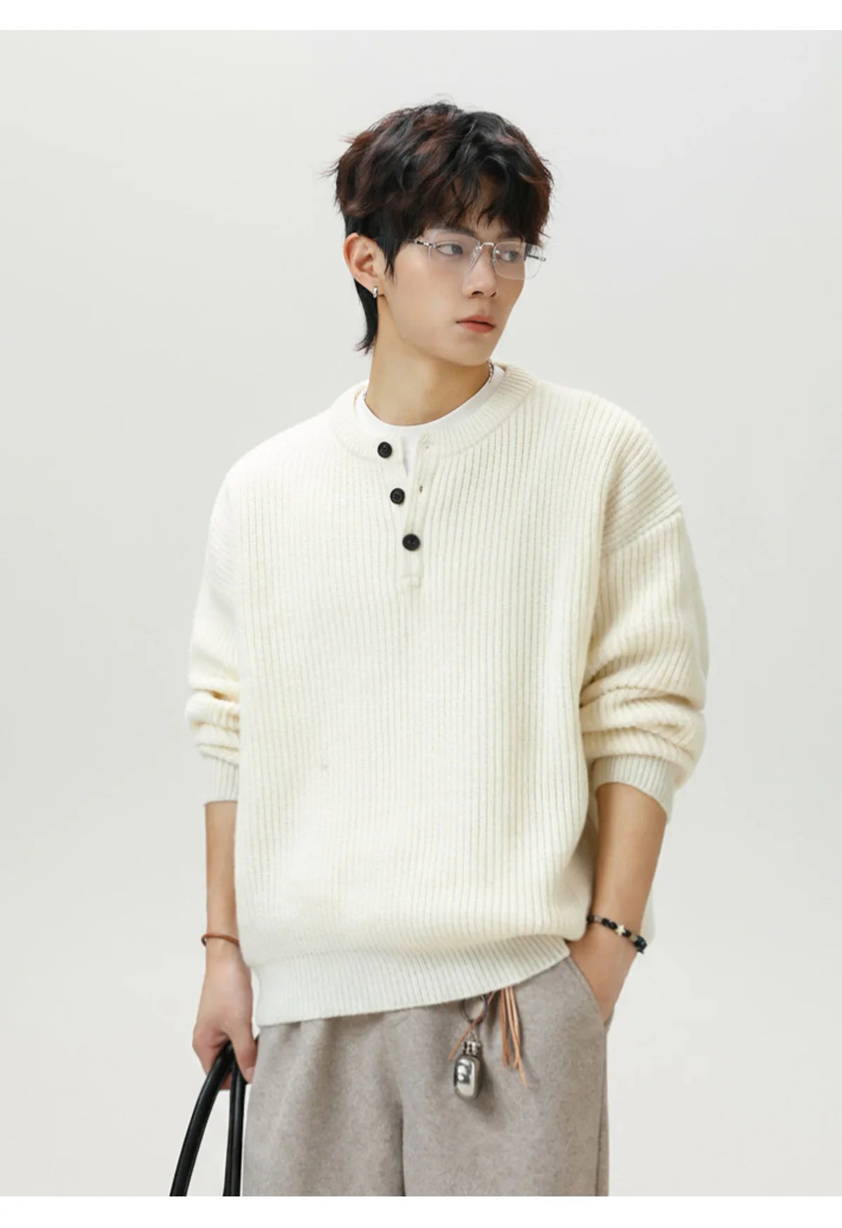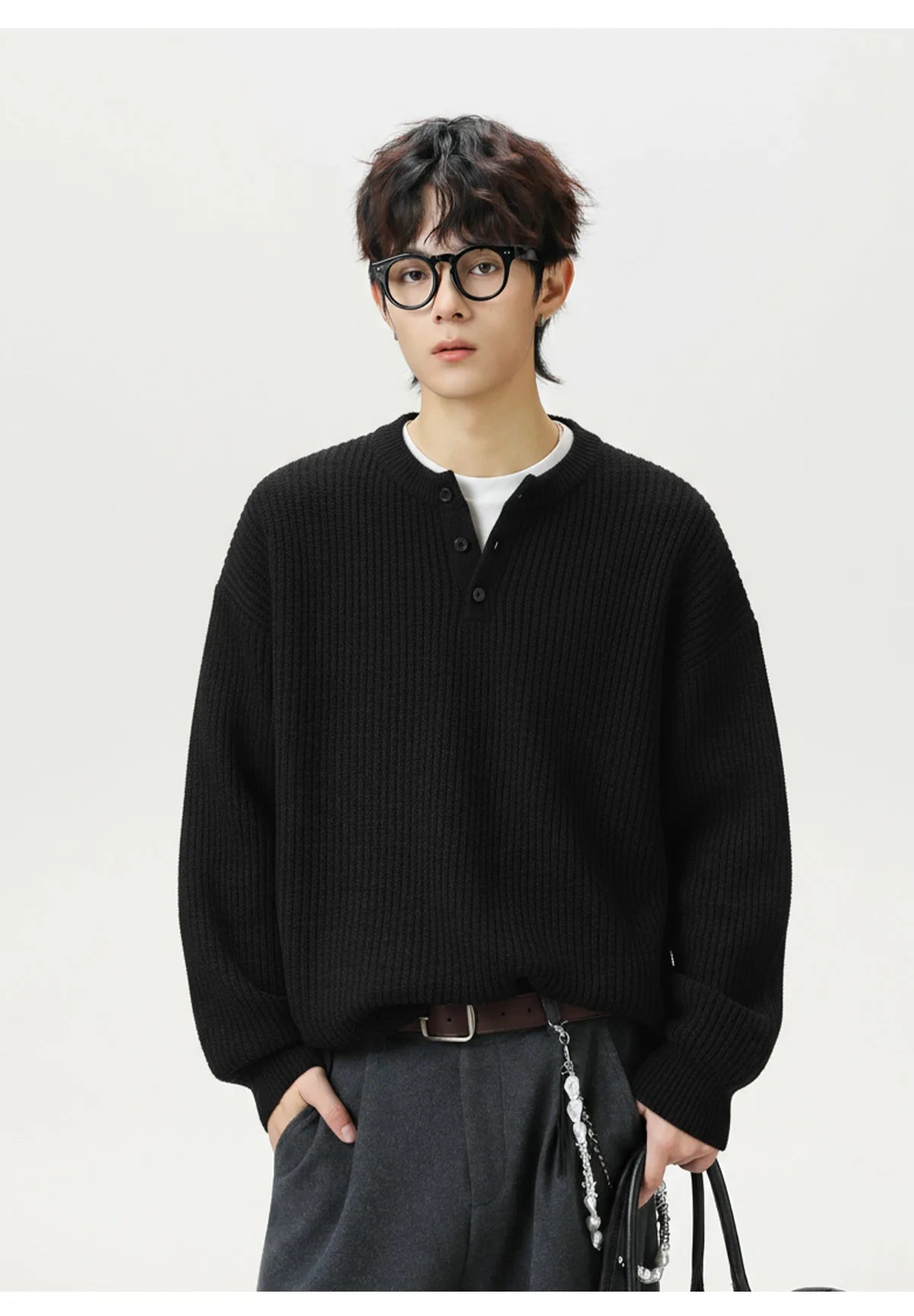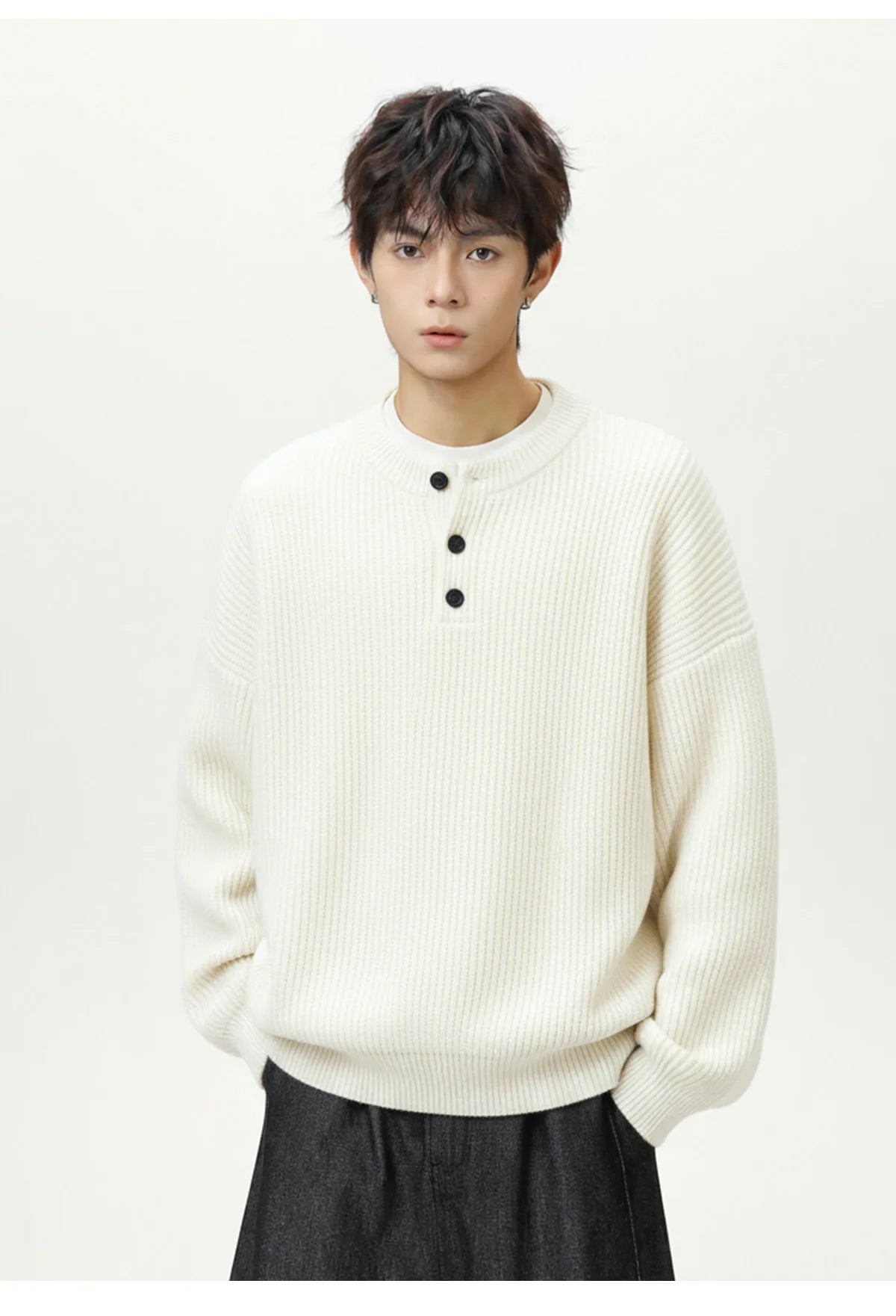 A simple knit designed for everyday wear. The Rib Knit Henley Sweater features a textured vertical rib knit with a classic Henley neckline and button placket for a clean, relaxed look. Comfortable and easy to layer, it’s a versatile piece that works well through the cooler seasons with denim, trousers or casual outfits.