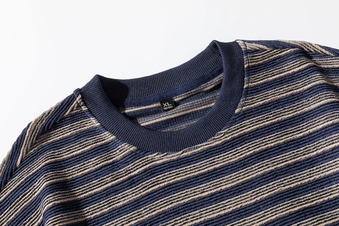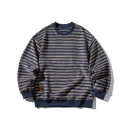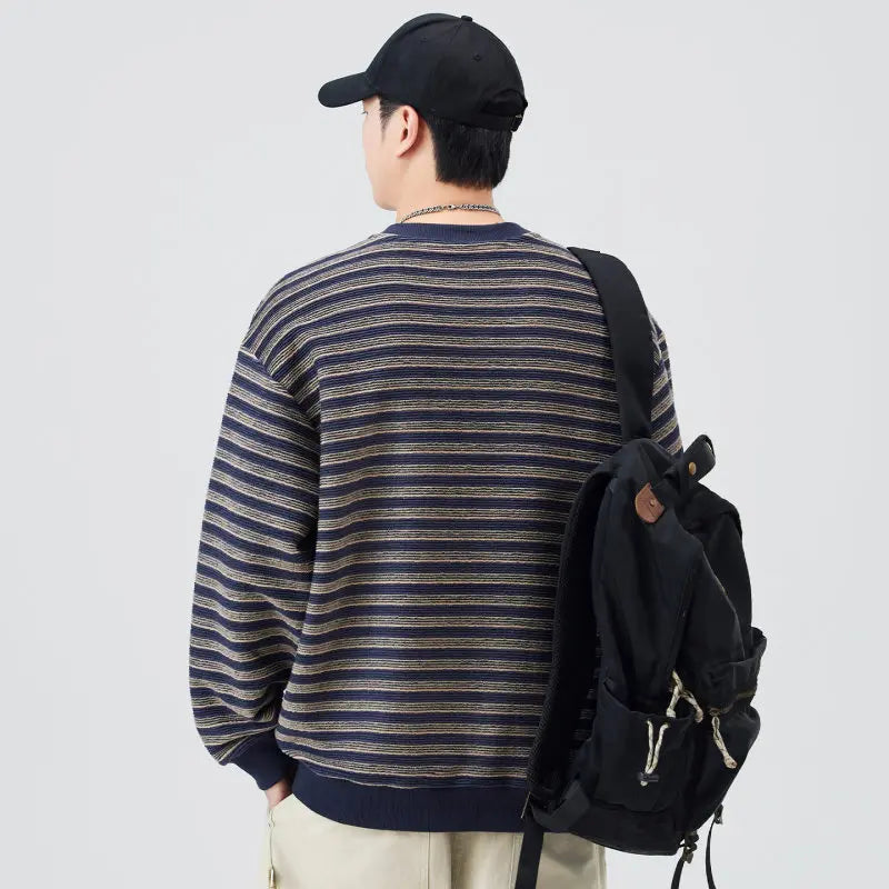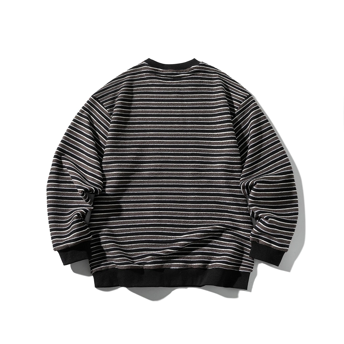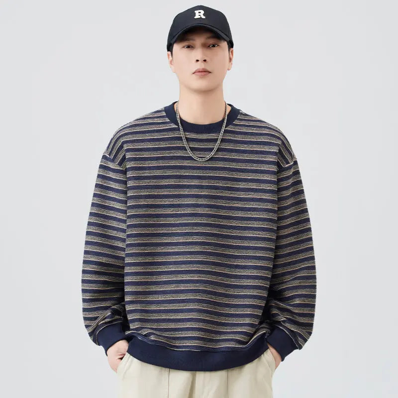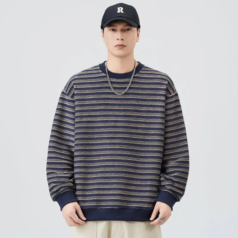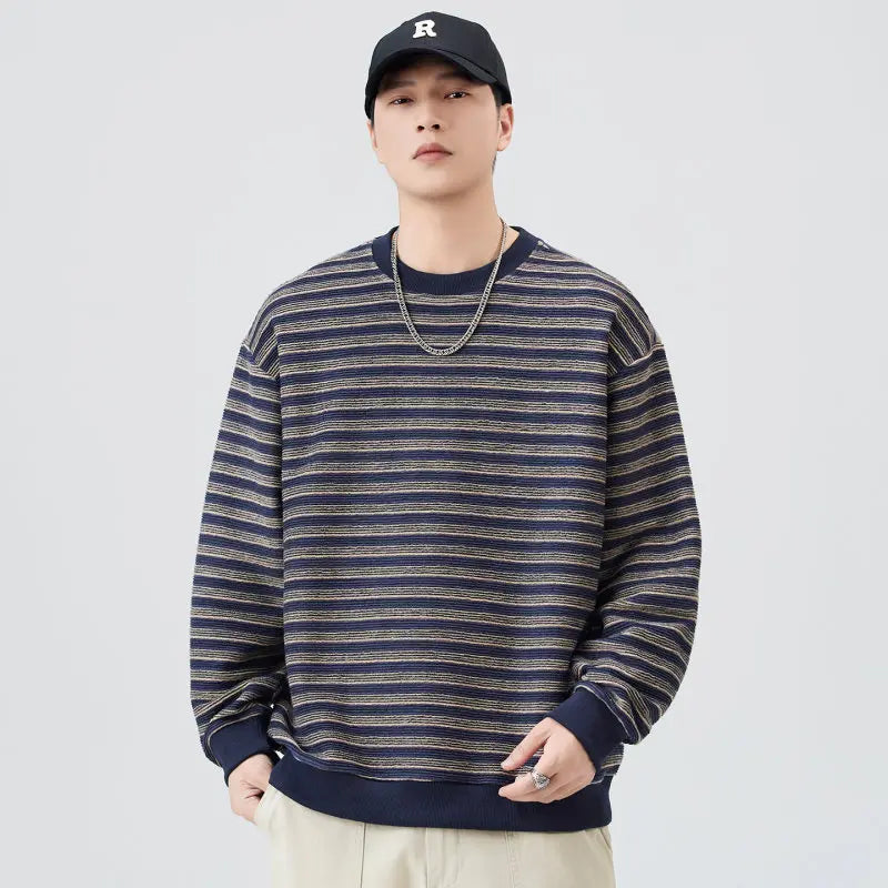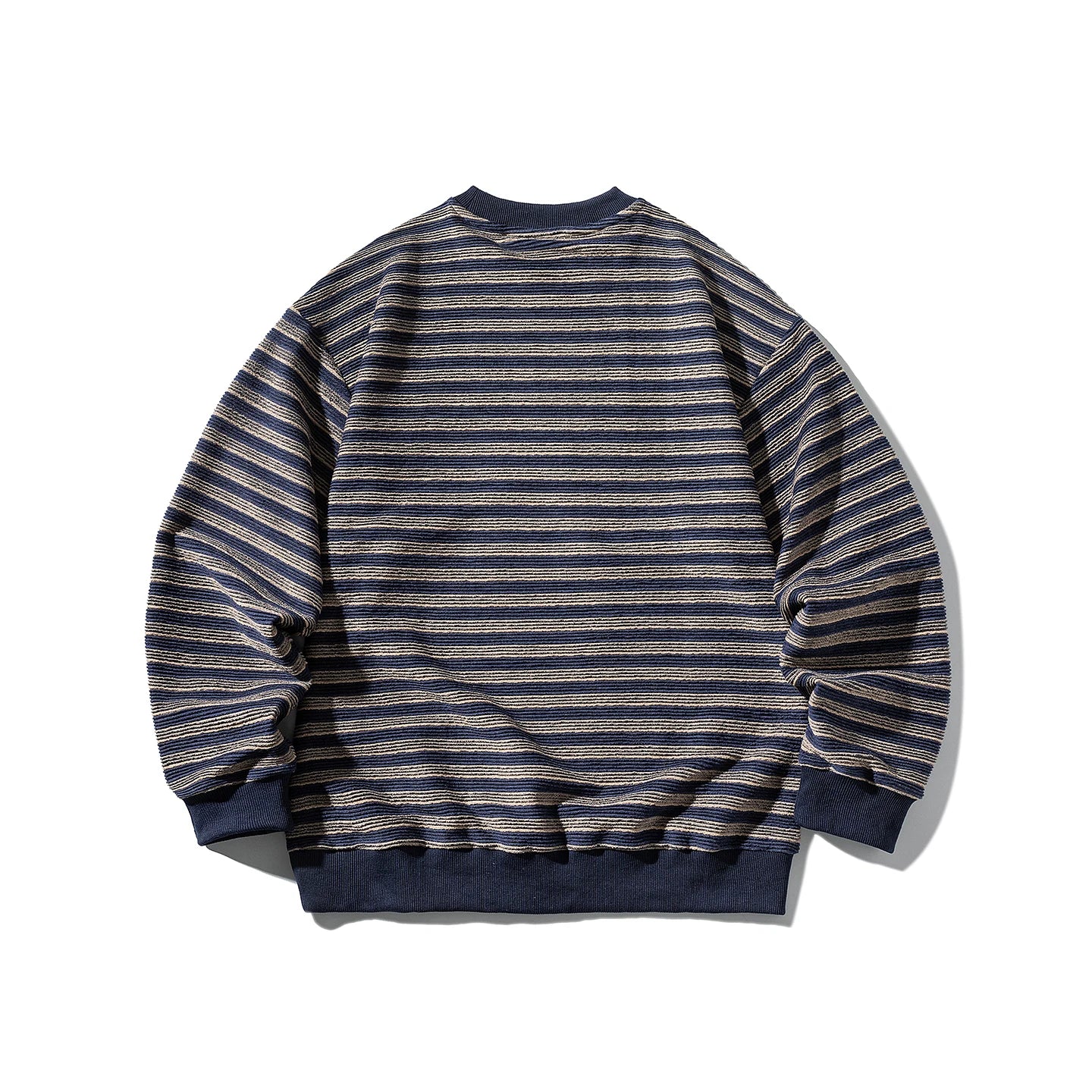 Blending retro-inspired pattern with modern comfort, the Reverse Knit Stripe Sweatshirt is cut in a boxy silhouette and crafted from a textured cotton-poly blend. The reverse knit construction gives the stripes a raised, tactile finish, adding depth to the navy and sand palette. Designed with ribbed trims and a relaxed drop-shoulder fit, it’s a Seoul streetwear take on the classic striped crew.