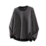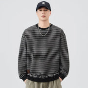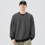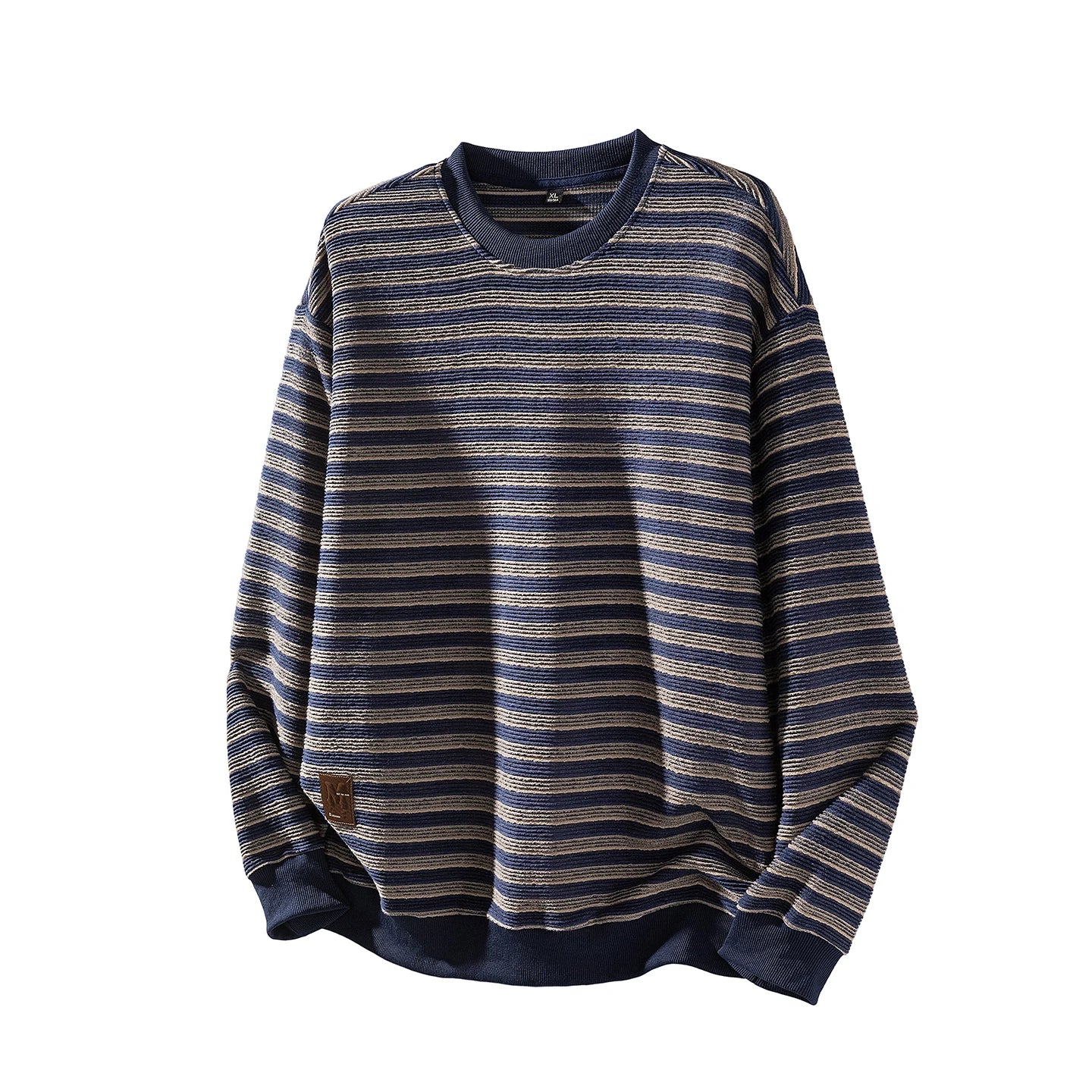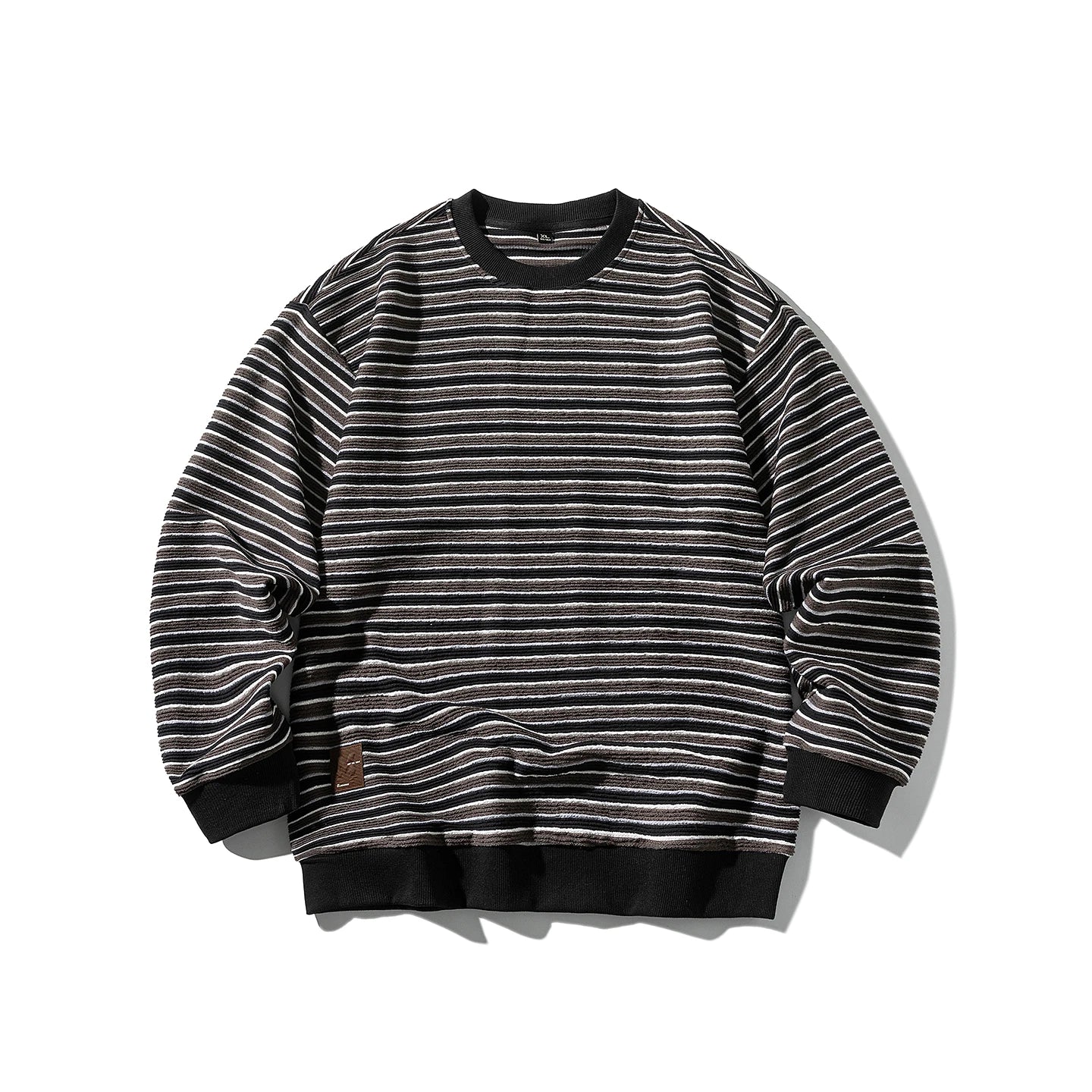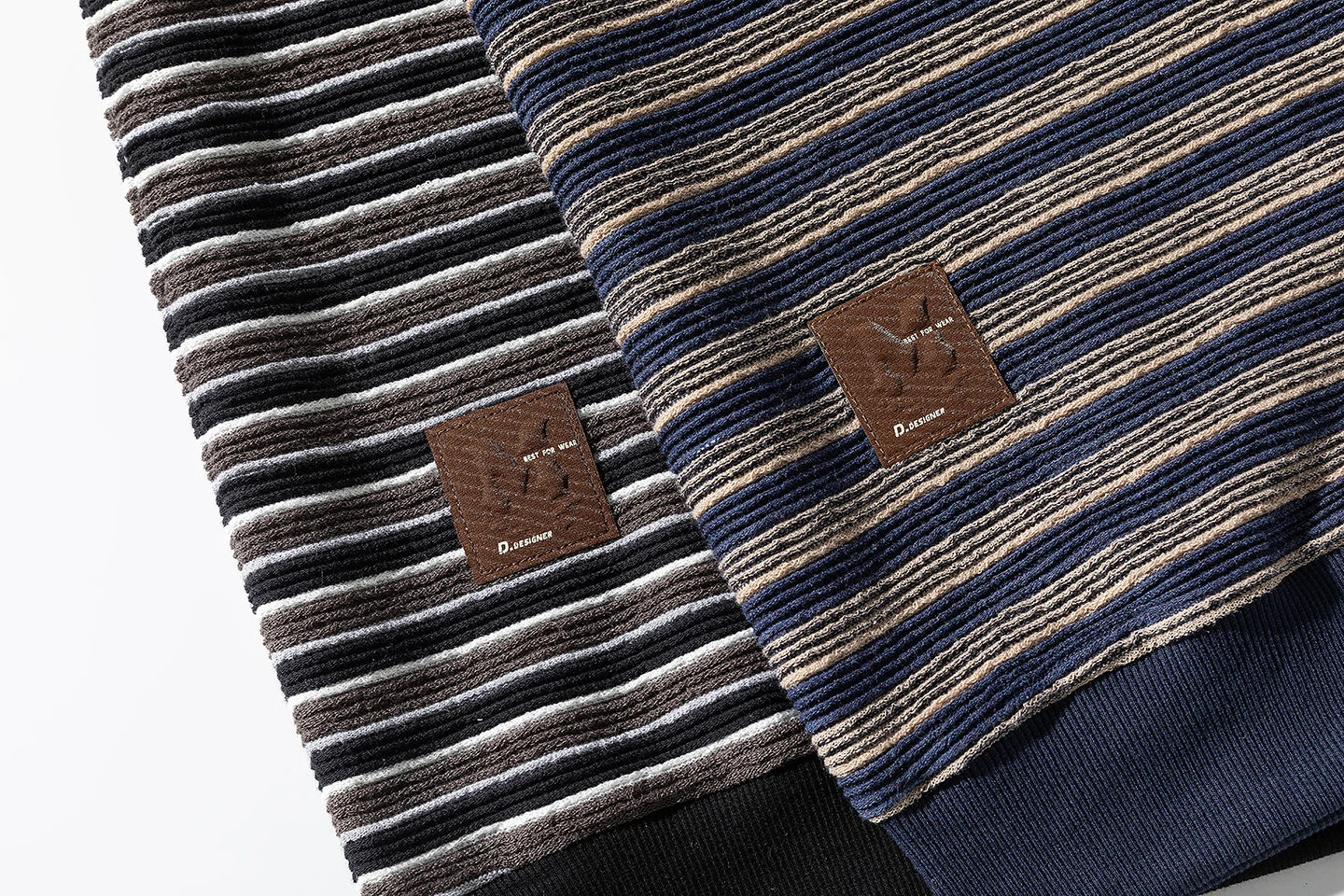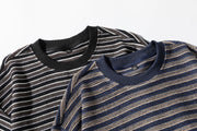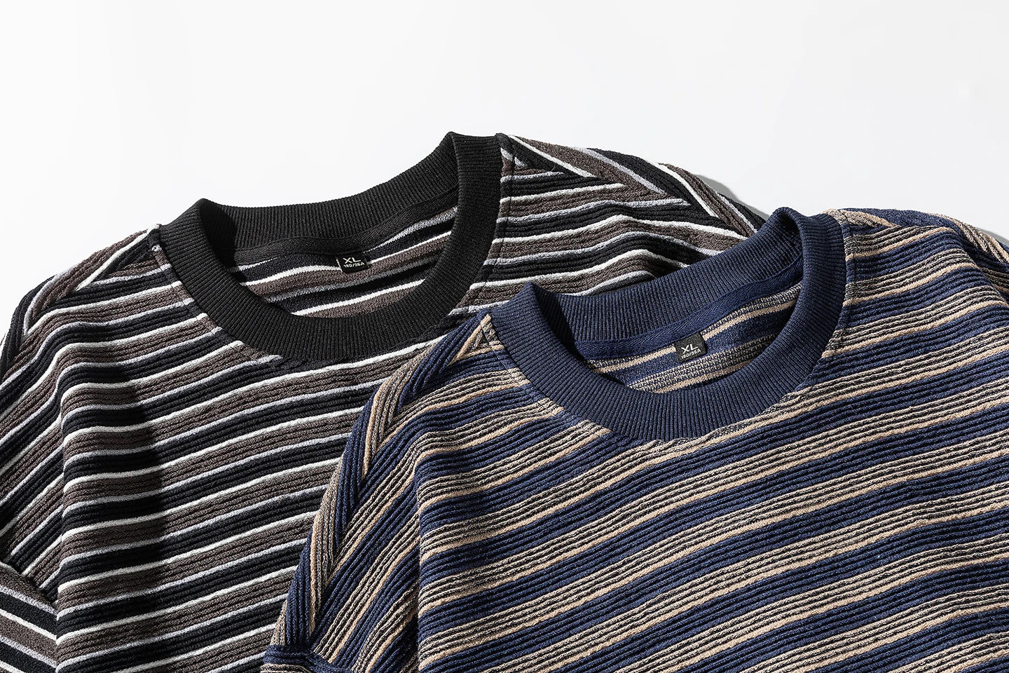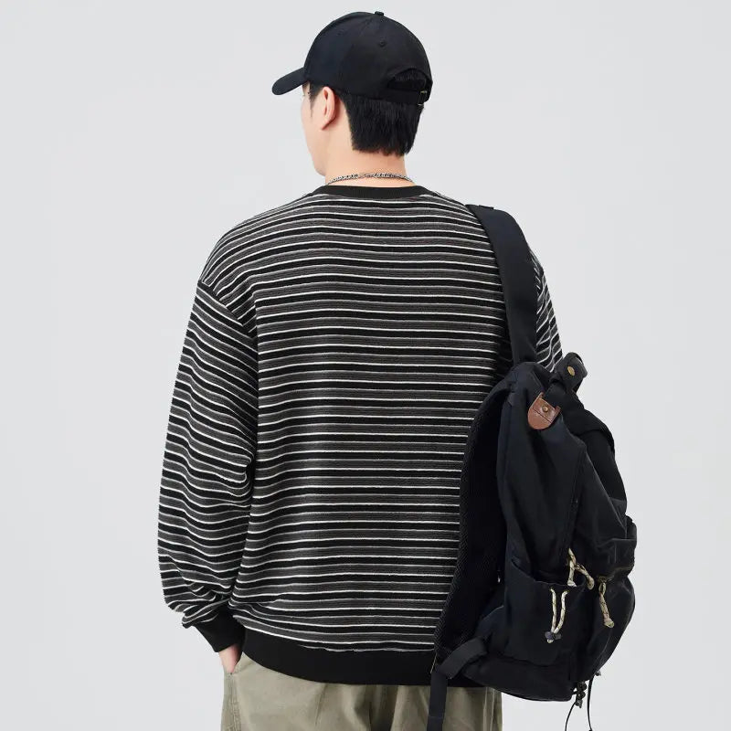 Blending retro-inspired pattern with modern comfort, the Reverse Knit Stripe Sweatshirt is cut in a boxy silhouette and crafted from a textured cotton-poly blend. The reverse knit construction gives the stripes a raised, tactile finish, adding depth to the navy and sand palette. Designed with ribbed trims and a relaxed drop-shoulder fit, it’s a Seoul streetwear take on the classic striped crew.