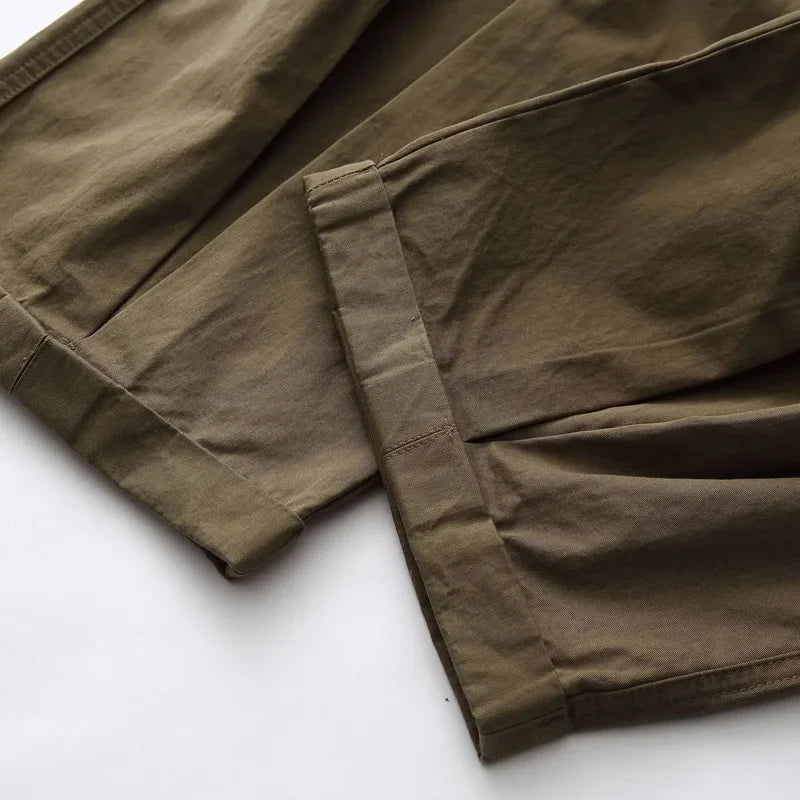- Cropped length with cuffed hems