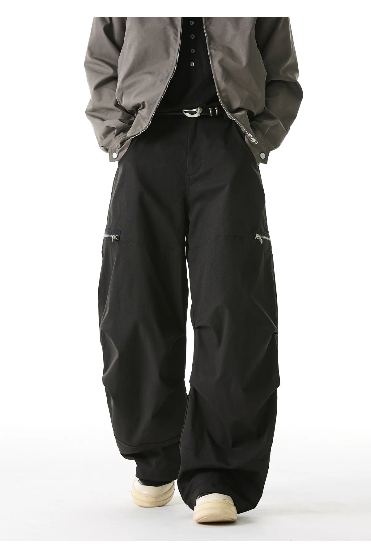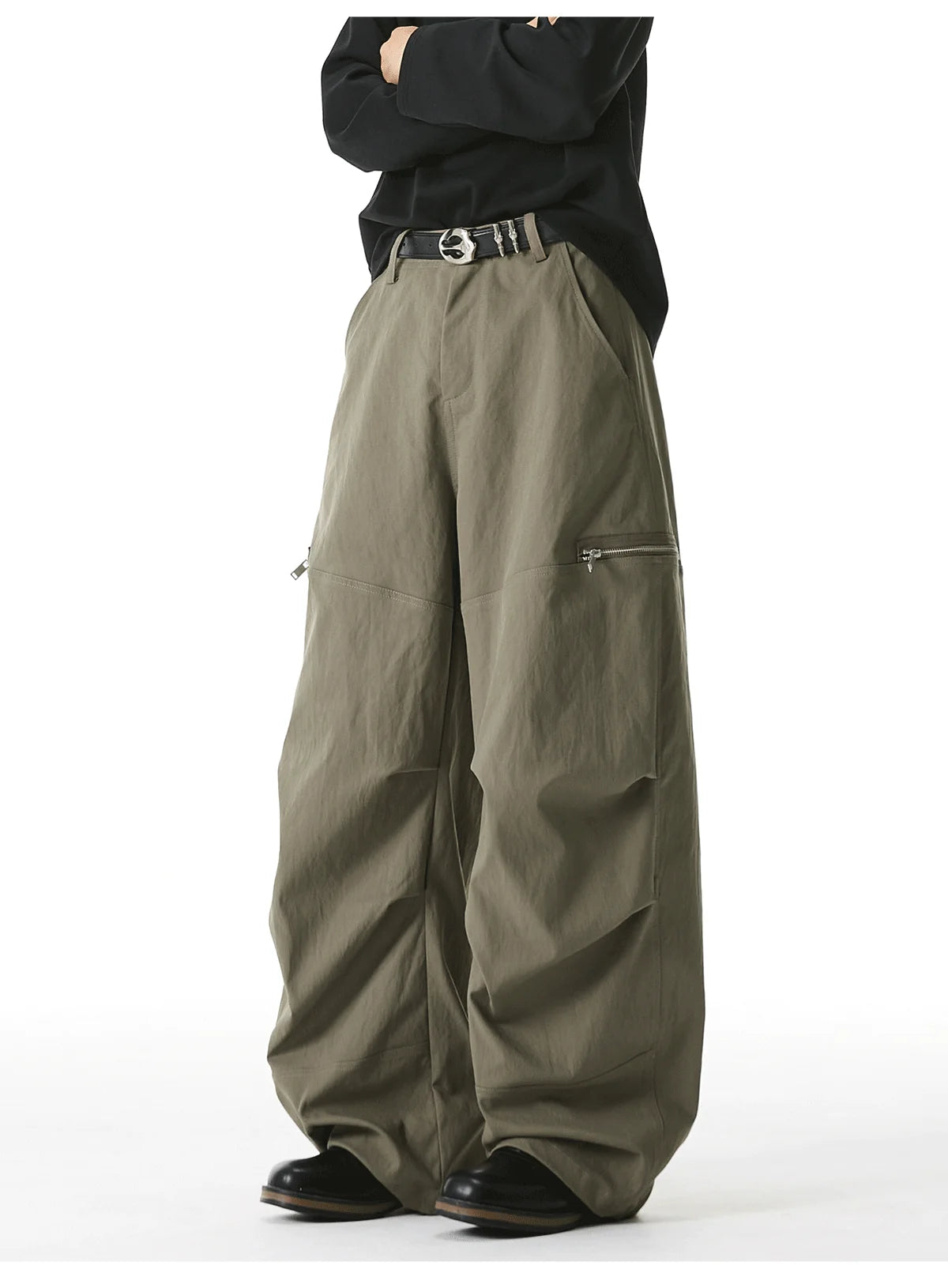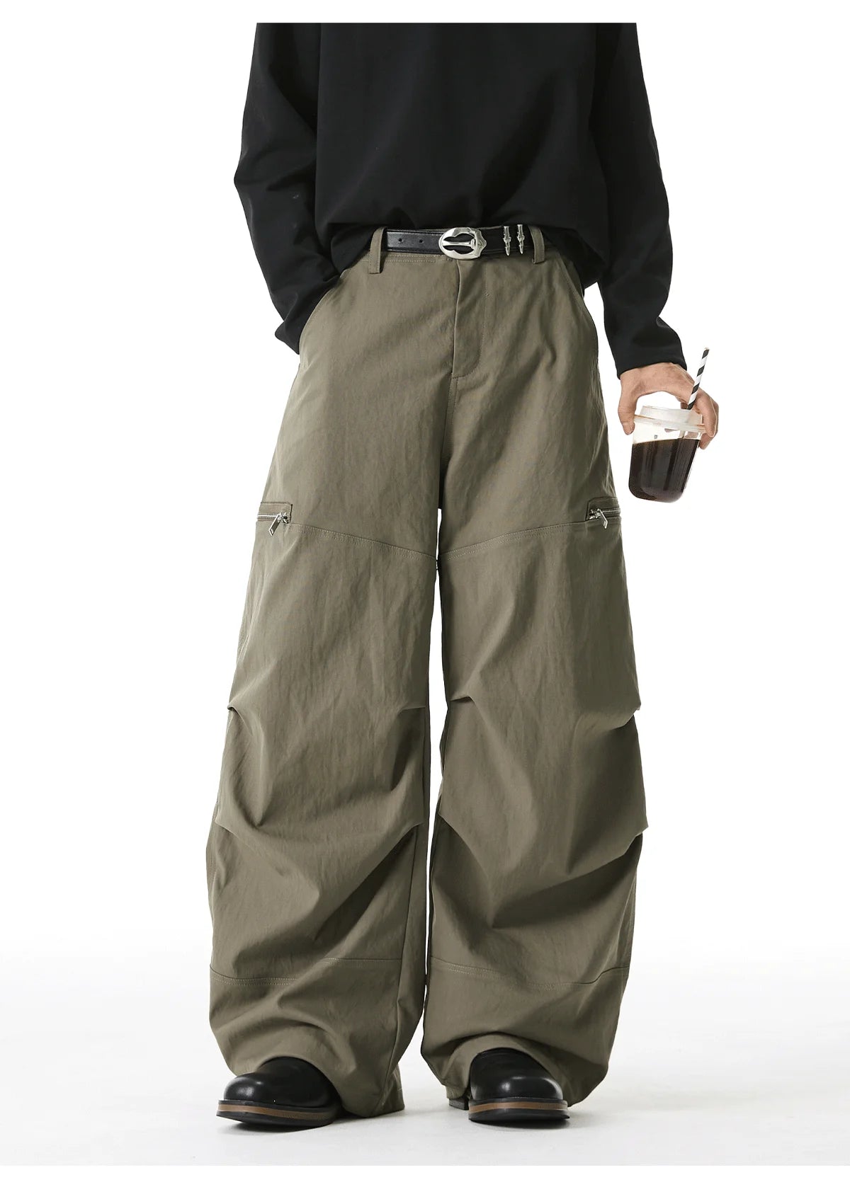 The Knee Pleat Parachute Pants bring a structured, oversized fit with utilitarian details. Designed with pleated knees for mobility, side zippers for a layered look, and a half-elastic back waist for comfort. A clean Seoul-inspired silhouette that fuses military cues with modern streetwear.