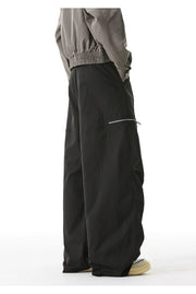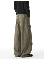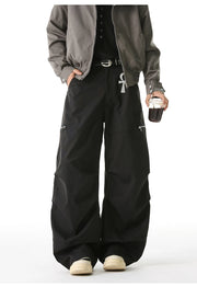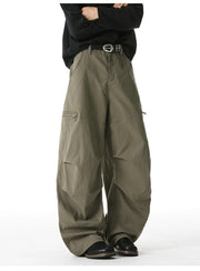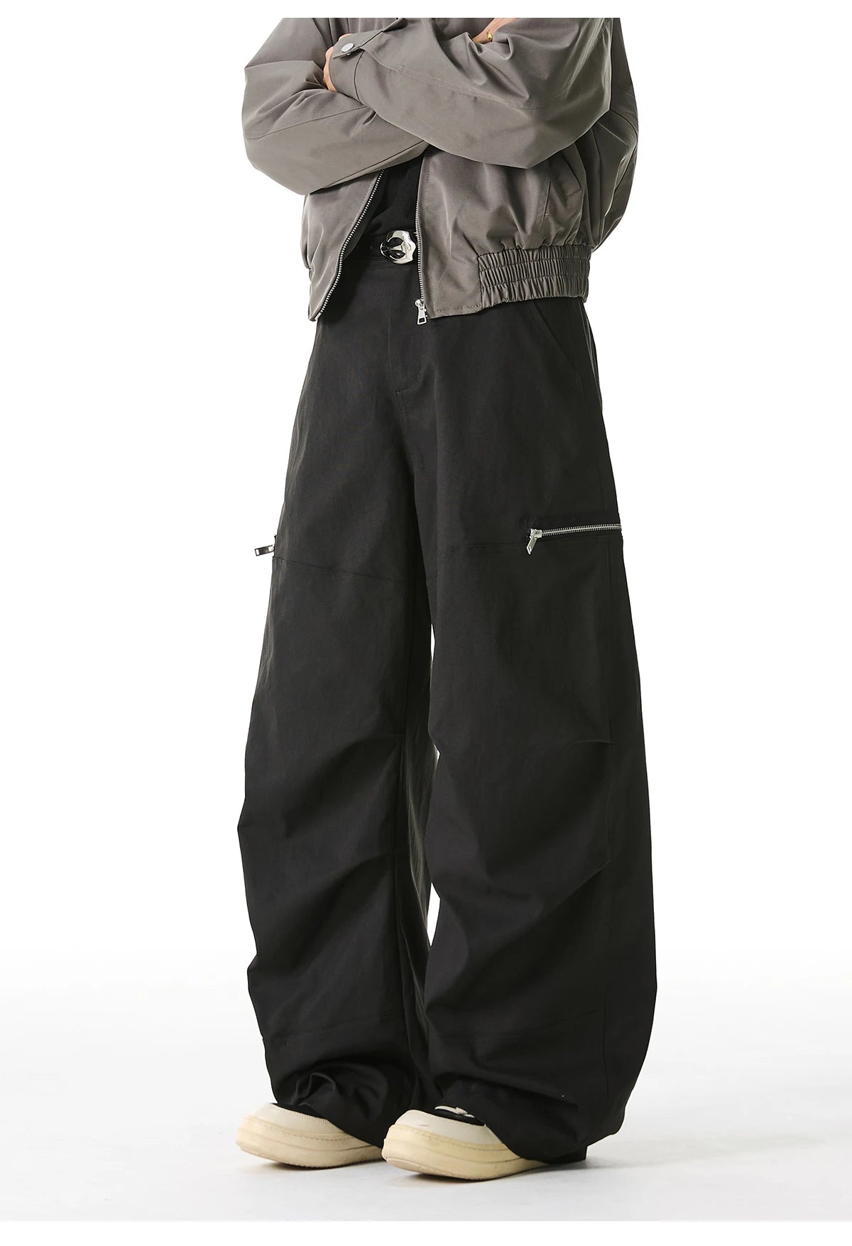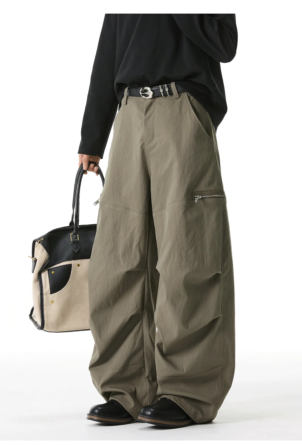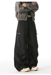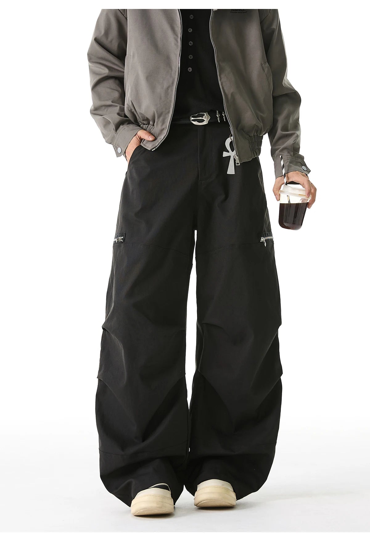 The Knee Pleat Parachute Pants bring a structured, oversized fit with utilitarian details. Designed with pleated knees for mobility, side zippers for a layered look, and a half-elastic back waist for comfort. A clean Seoul-inspired silhouette that fuses military cues with modern streetwear.