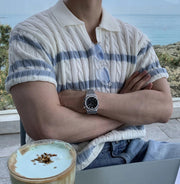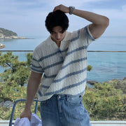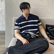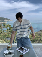 A modern update on a retro classic, this polo knit is cut with a relaxed silhouette and finished with an open collar for effortless styling. The cable-knit body is contrasted with subtle horizontal stripes, balancing texture and clean lines. Lightweight and breathable, it brings a touch of refinement to everyday dressing while keeping a casual edge.