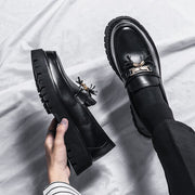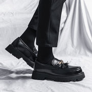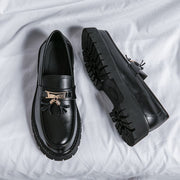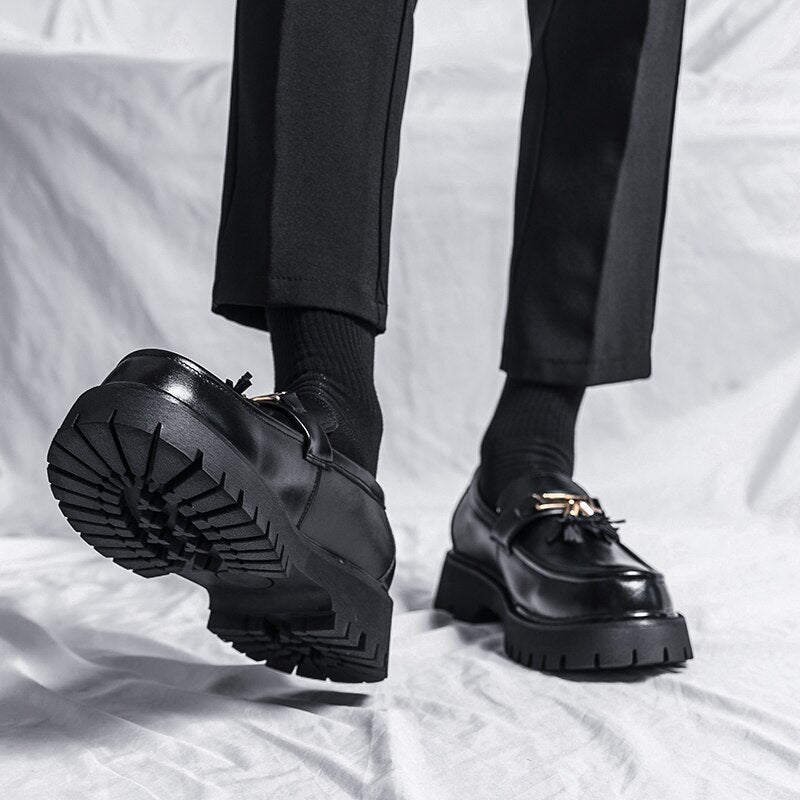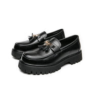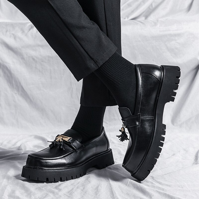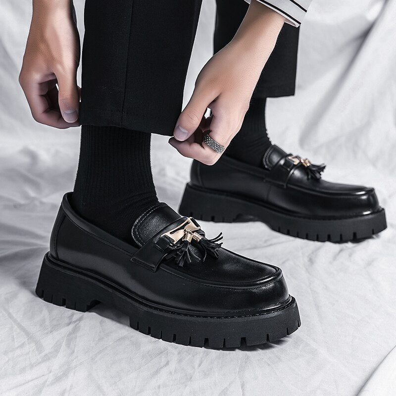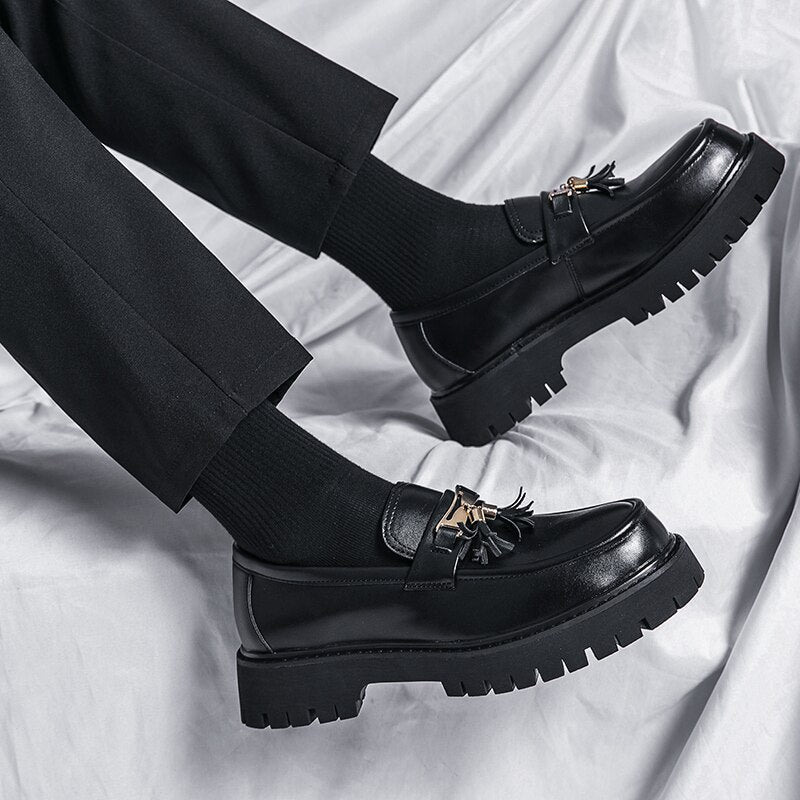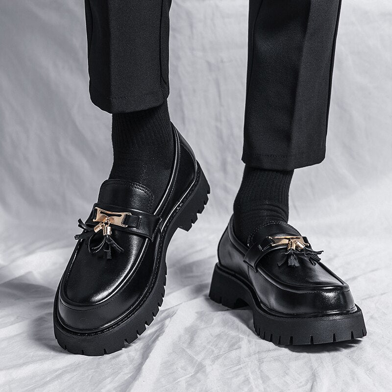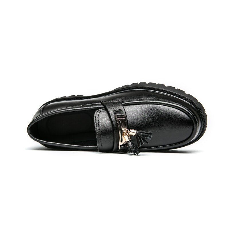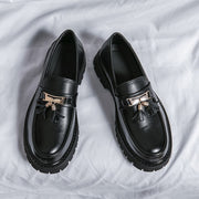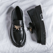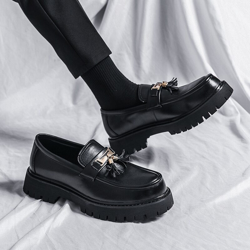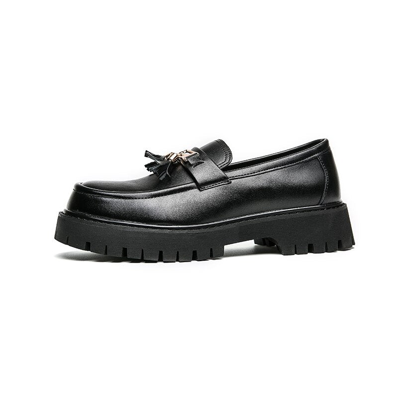 Uplift your look with our Hagye Tassel Chunky Sole Loafers, crafted from a luxuriously soft polyurethane upper and a weighty rubber sole. Their elevated silhouette is finished with sophisticated details like a gold-tone metal plate and a prominent tassel for a considered touch of texture. Opulent and stylish, these classic loafers make for a timelessly tasteful wardrobe staple.