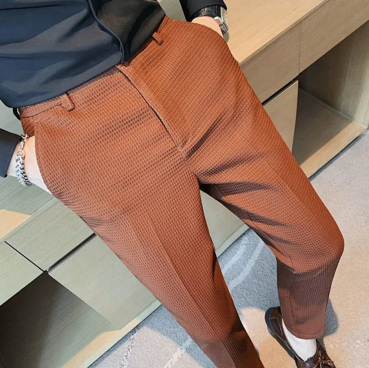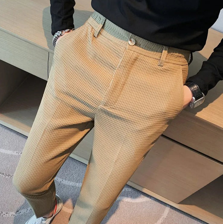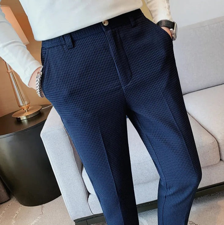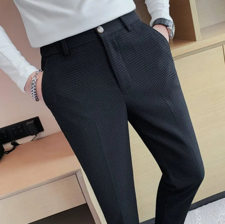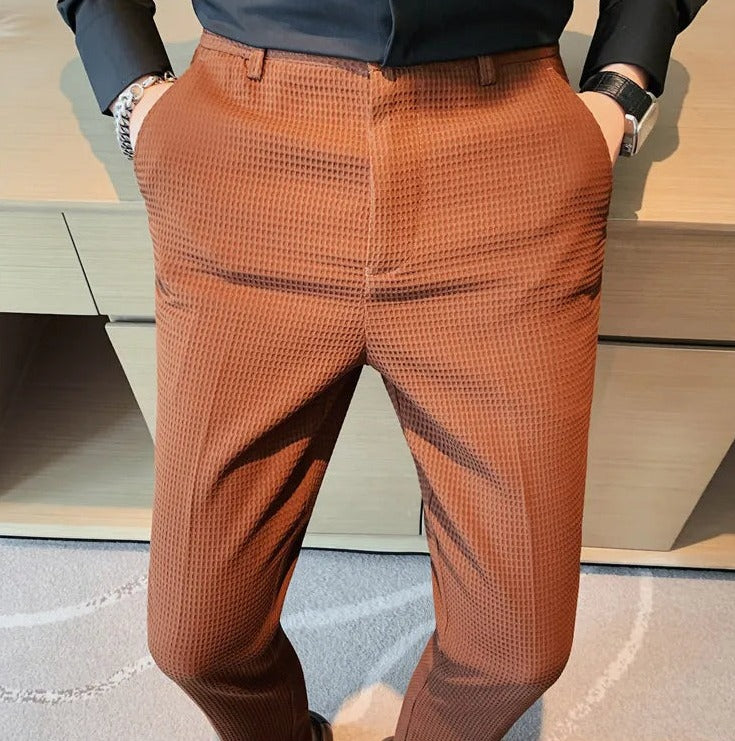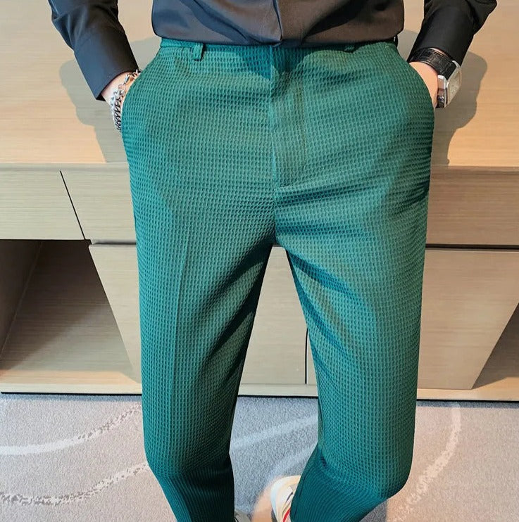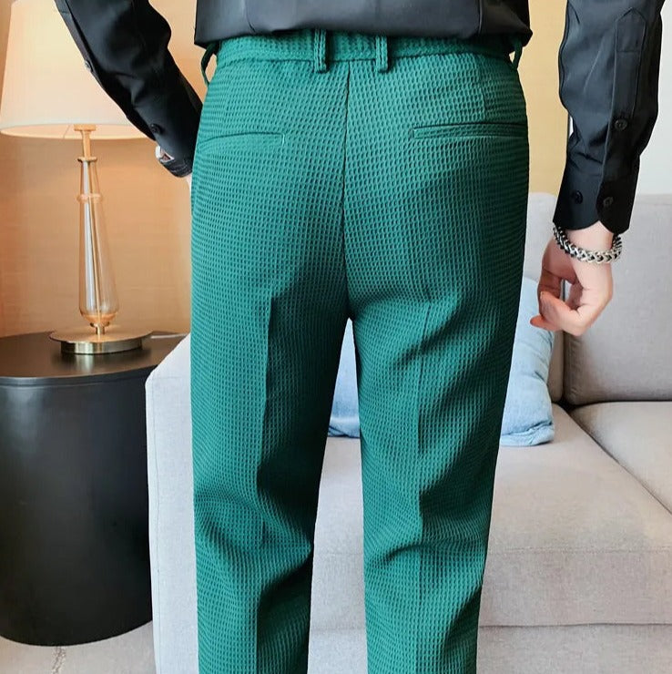 Experience the perfect blend of style and comfort with these Waffle Texture Slim Fit Smart Trousers. It is crafted from lightweight polyester with a subtle yet distinctive waffle texture, featuring a button fly fastening, side pockets, and belt loops.