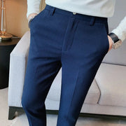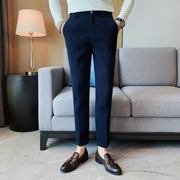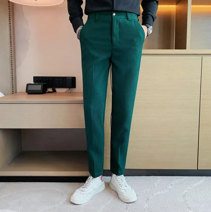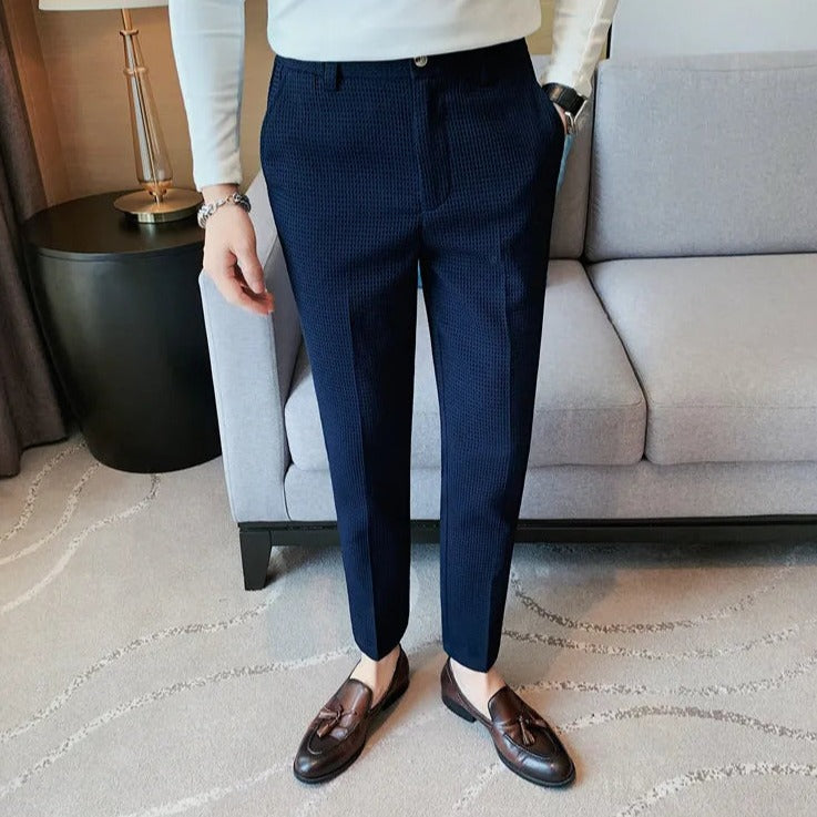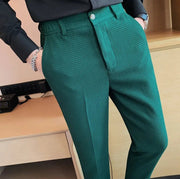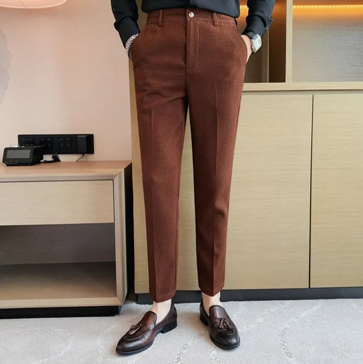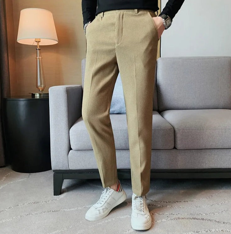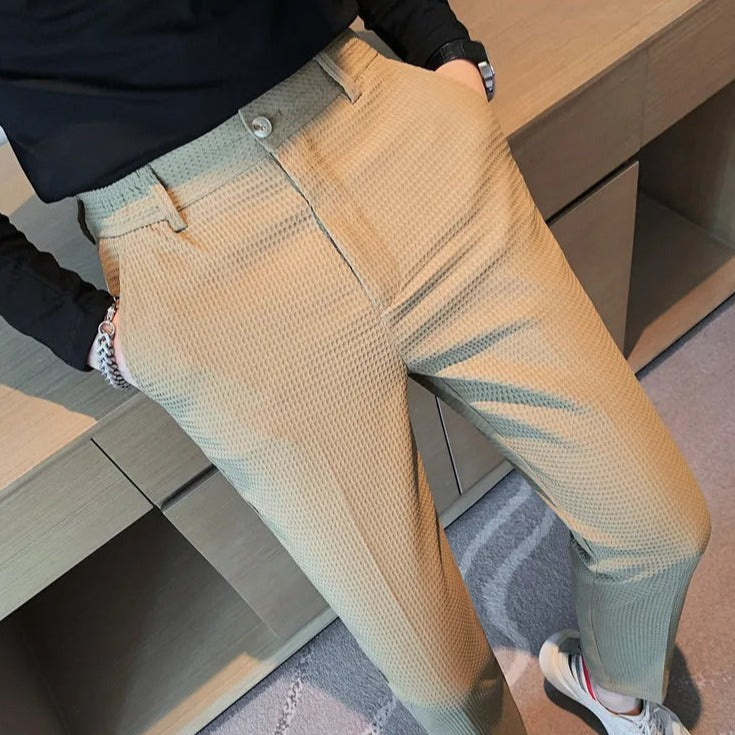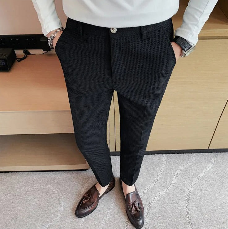 Experience the perfect blend of style and comfort with these Waffle Texture Slim Fit Smart Trousers. It is crafted from lightweight polyester with a subtle yet distinctive waffle texture, featuring a button fly fastening, side pockets, and belt loops.