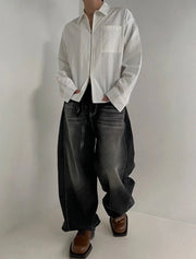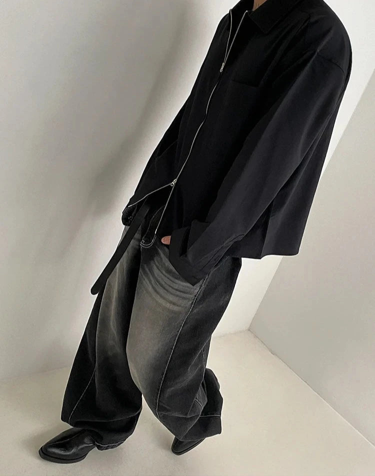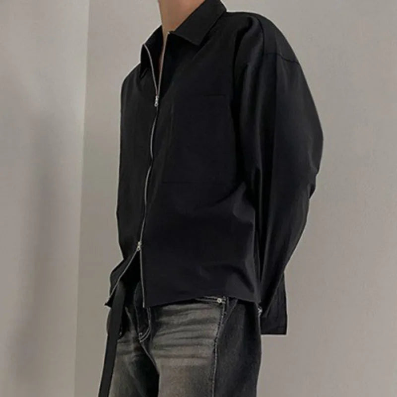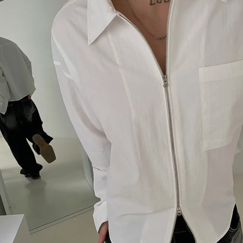 This unique shirt features a spread collar, zip-up front, and dropped sleeves for a comfortable and stylish fit. With a chest pocket and button-up sleeves, it offers both convenience and versatility.