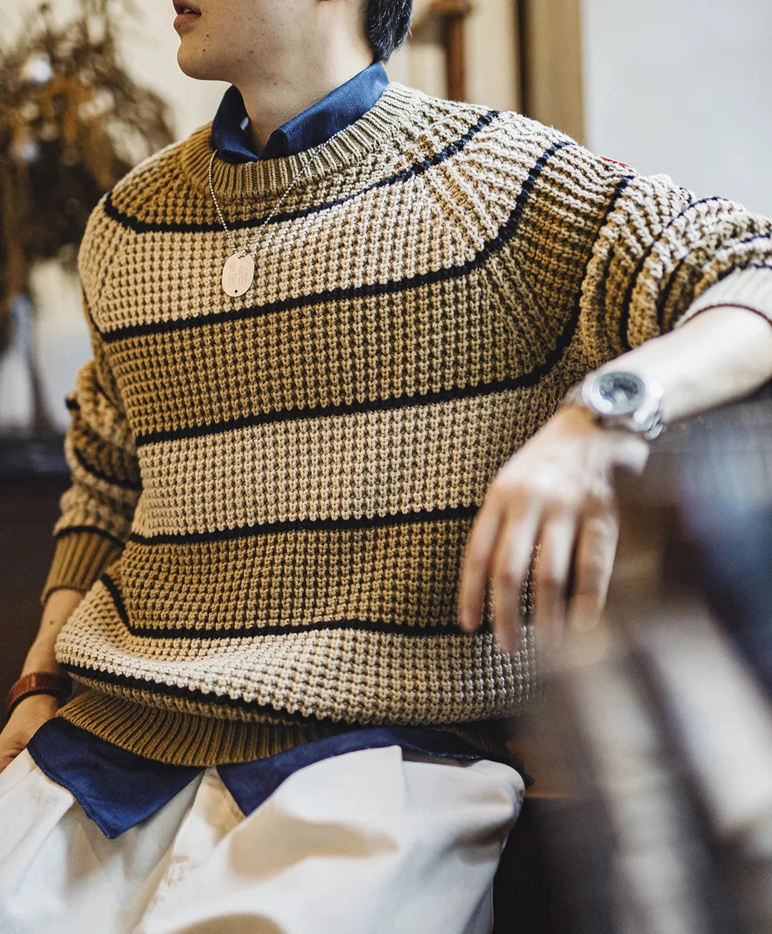 Experience warmth and comfort with our Chunky Knit Yarn Dyed Stripe Raglan Sweater. Made with a blend of cotton and acrylic, this sweater features a crew neck and long raglan sleeves for a cosy fit.