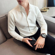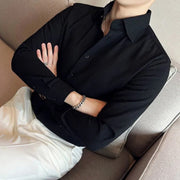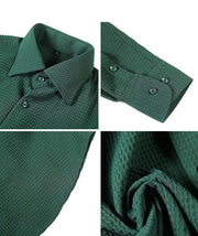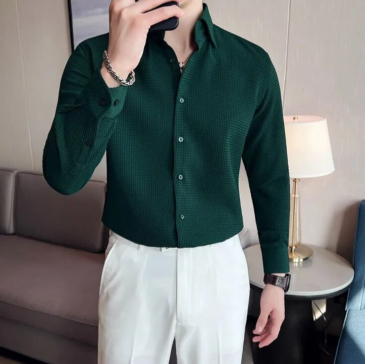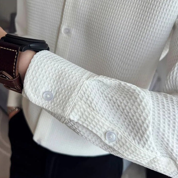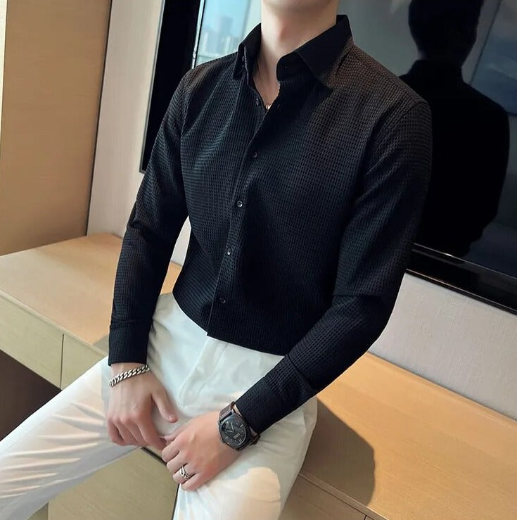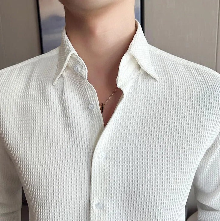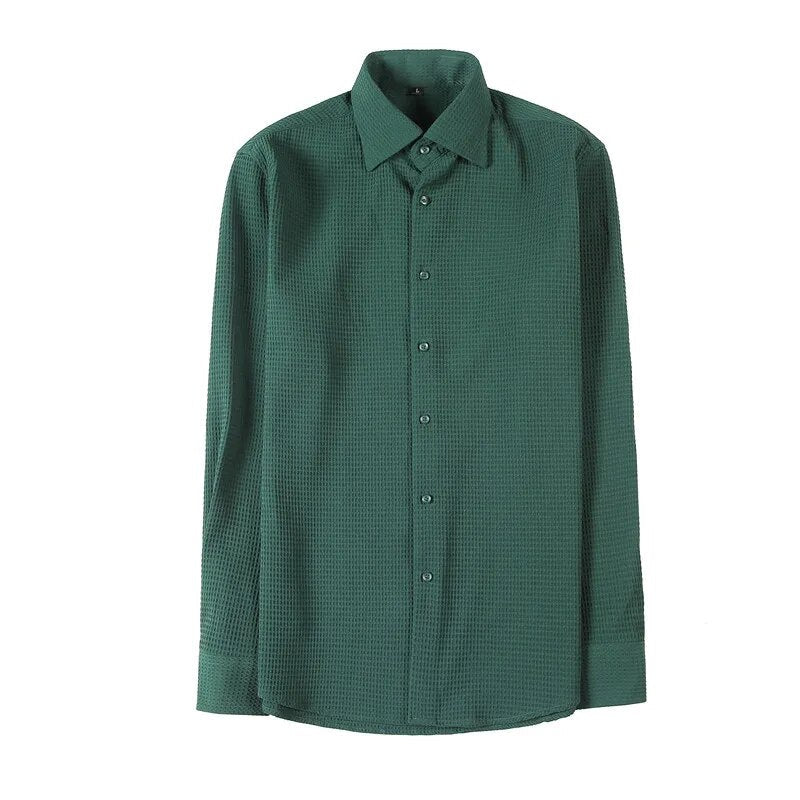 Crafted with luxurious polyester fabric featuring a subtle waffle texture, this timeless button-up shirt is the definition of sophistication. Its spread collar, long sleeves, and button placket create an elegant minimal look, perfect for any occasion.