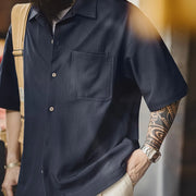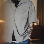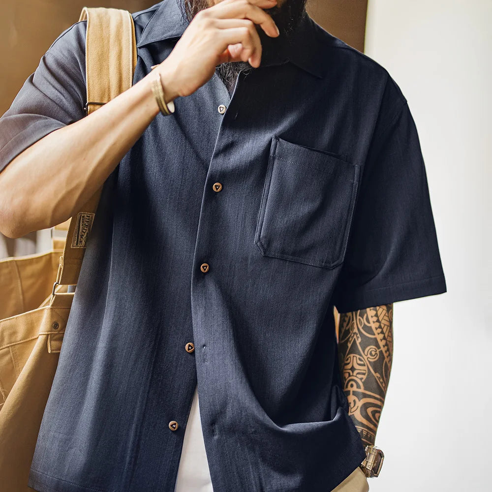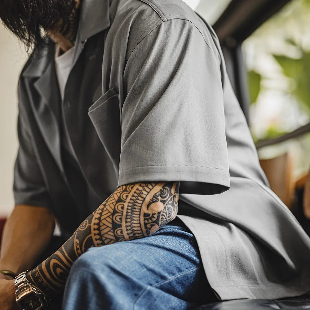 Cuban collar with open, camp‑style design for easy, collar‑less drape