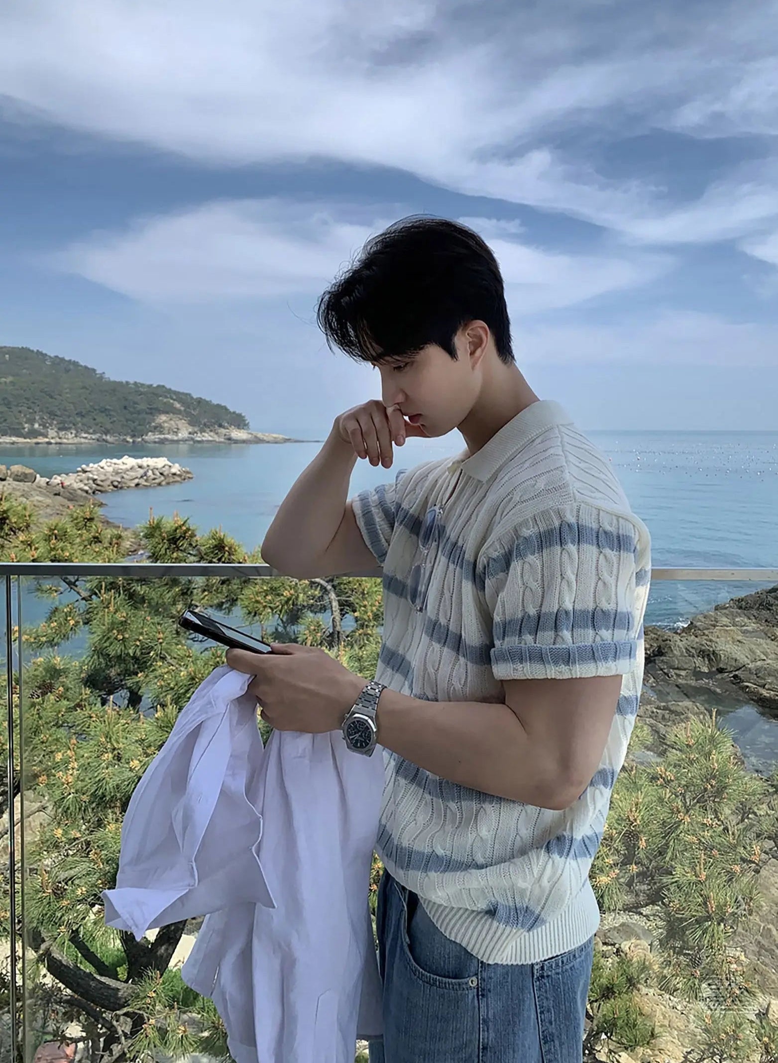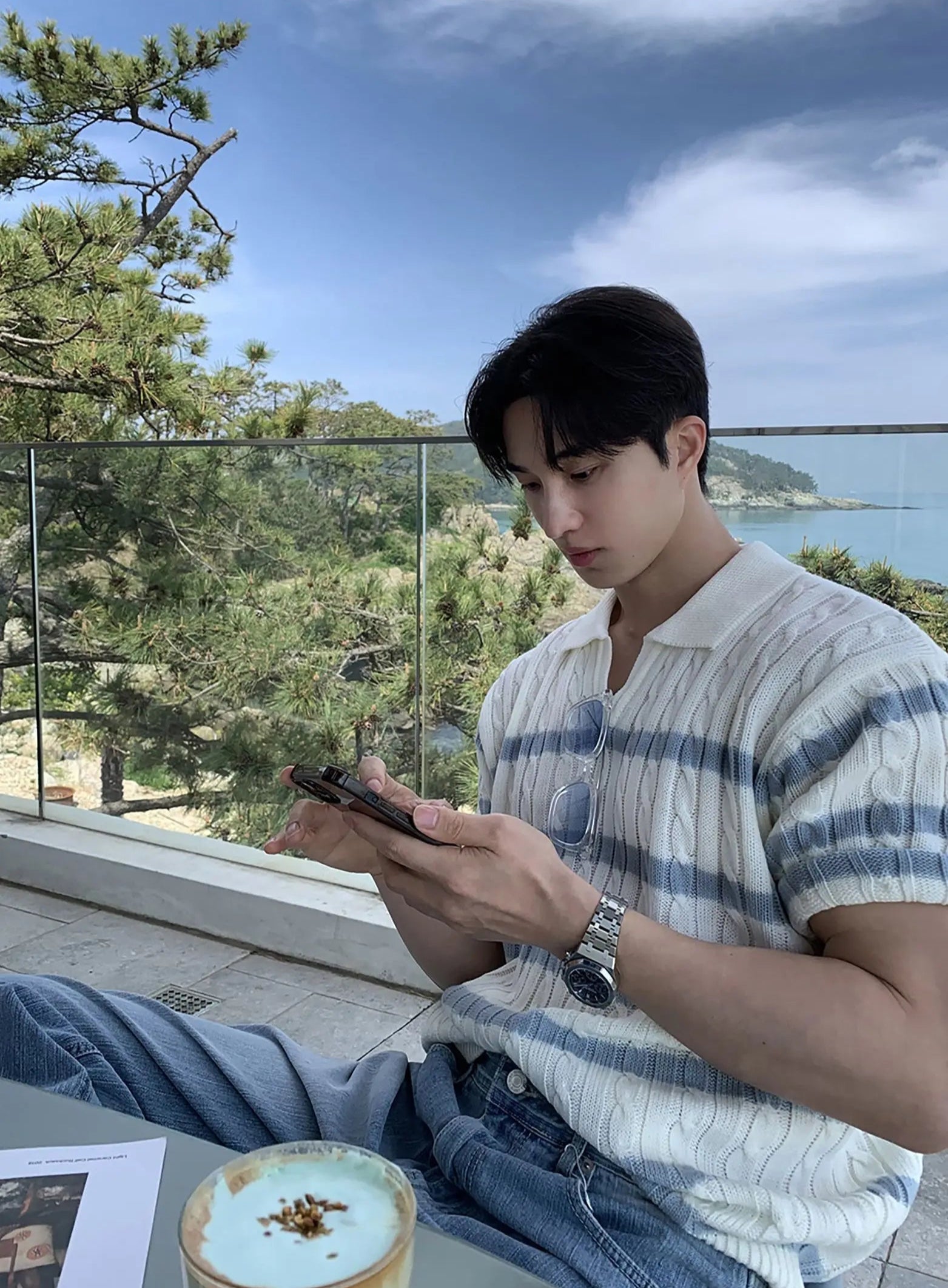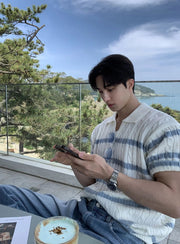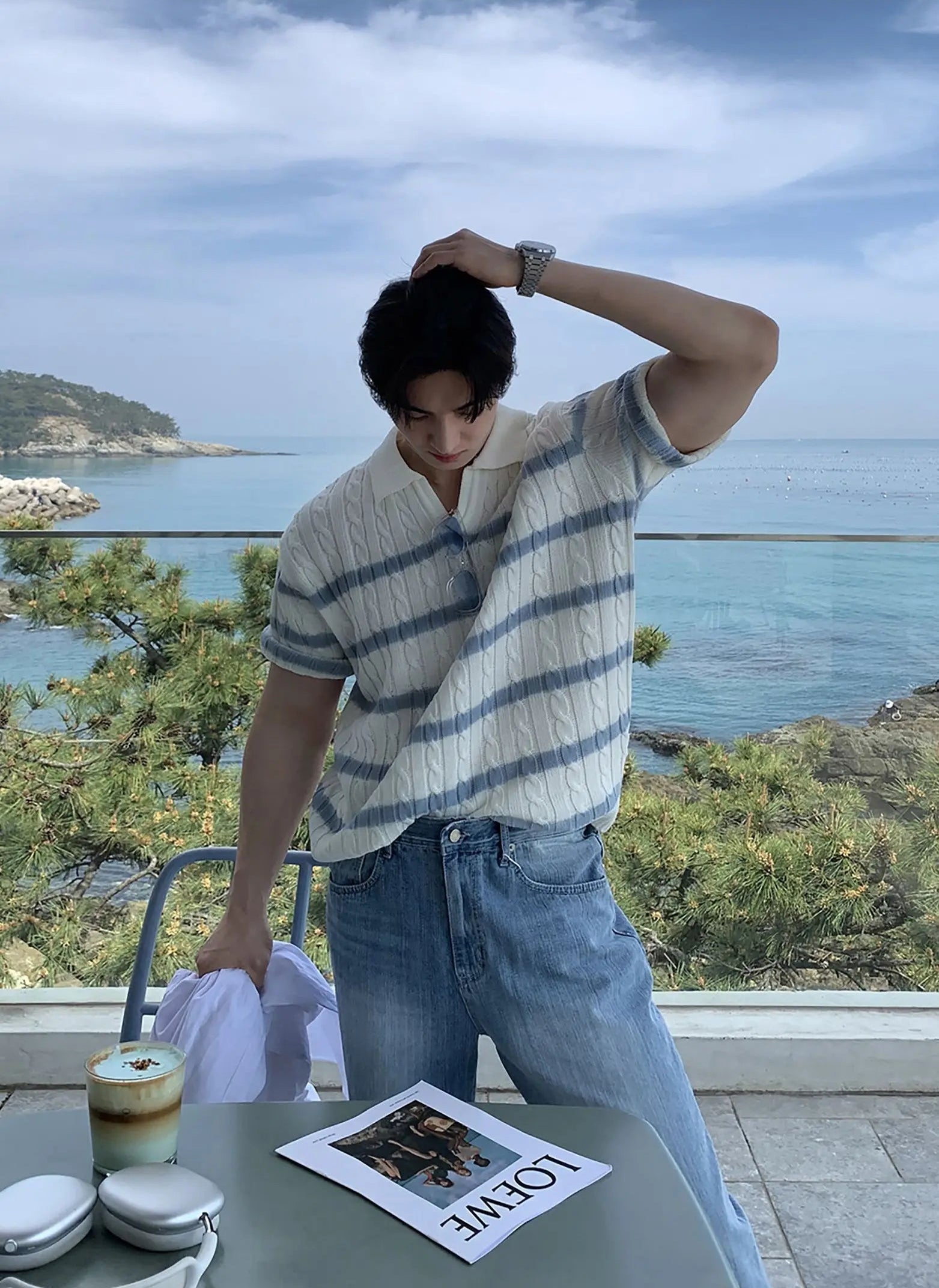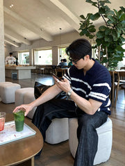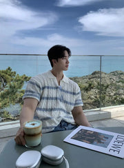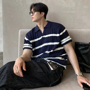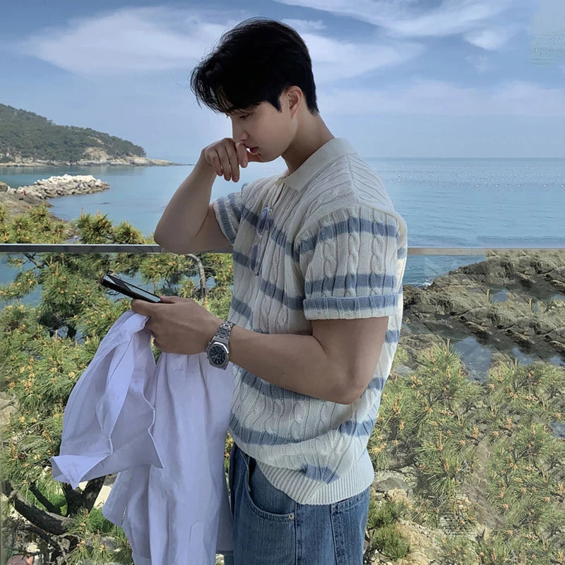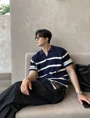 A modern update on a retro classic, this polo knit is cut with a relaxed silhouette and finished with an open collar for effortless styling. The cable-knit body is contrasted with subtle horizontal stripes, balancing texture and clean lines. Lightweight and breathable, it brings a touch of refinement to everyday dressing while keeping a casual edge.
